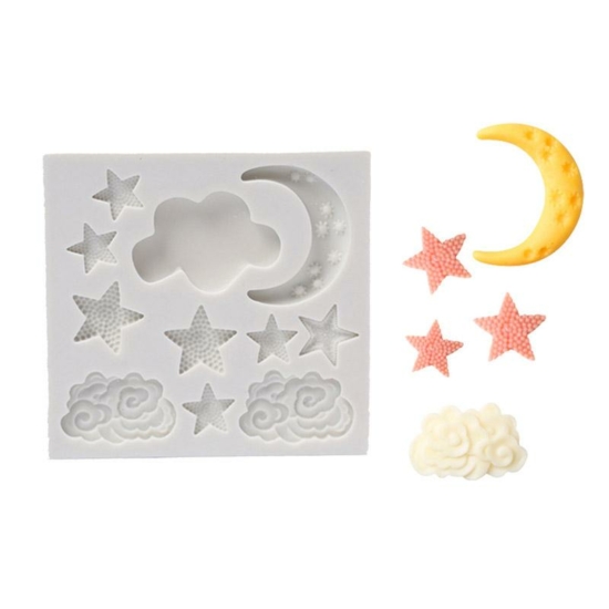 A szilikonformával 3D csillag, hold és felhő készíthető. Az elkészített minta alkalmas torták és sütemények díszítésére. A mintázó kiváló minőségű rugalmas szilikonanyagból készült. Készíthető benne fondantból, marcipánból és csokoládéból is forma.A szilikon forma színe termékenként változhat. Méret: 8,6×8,1×1 cm. Használat előtt szükséges keményítővel megszórni (fondant és marcipán esetében).